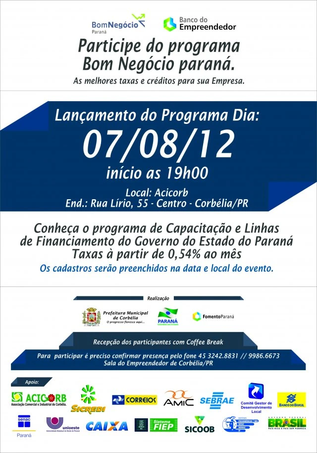 Corbélia estará sendo agraciada com a instalação do Programa Bom Negócio Paraná e Banco do Empreendedor