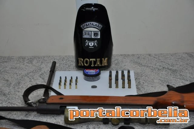 Atendendo a denuncia realizada ao 190, de que na vila rural campininha, em uma residencia havia uma arma de fogo do tipo espingarda a equipe deslocou-se ao local, localizando na residencia, no quarto, duas espingardas sendo uma calibre 40 de dois canos, e uma carabina calibre 22 de fabricaçao caseira. Tambem foram localizadas 12 cartuchos de calibre 38, e 12 cartuchos de calibre 22.