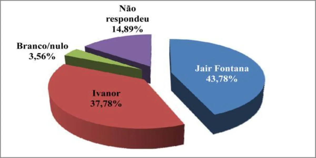 Foram ouvidos 450 eleitores, dos quais 43,78% disseram que votam no peemedebista Jair Fontana. Outros 37,78% manifestaram intenção de votar no candidato do PSD, Ivanor.