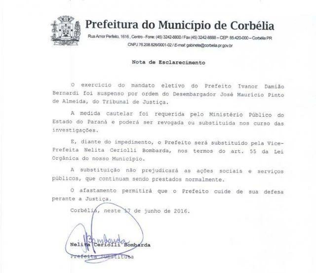 A Prefeita em exercício Nelita Ceriolli Bombarda, emitiu uma nota de esclarecimento na última sexta-feira dia 17 referente ao afastamento do prefeito Ivanor Bernardi.