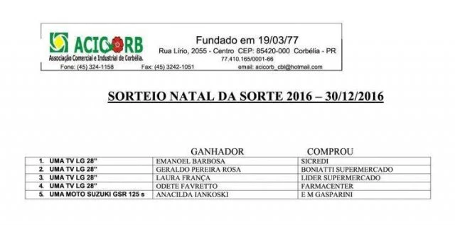 Foi realizado às 18h30 desta Sexta-Feira (30) na sede da ACICORB, Associação Comercial e Industrial de Corbélia, o sorteio da promoção Natal de Sorte Acicorb 2016.