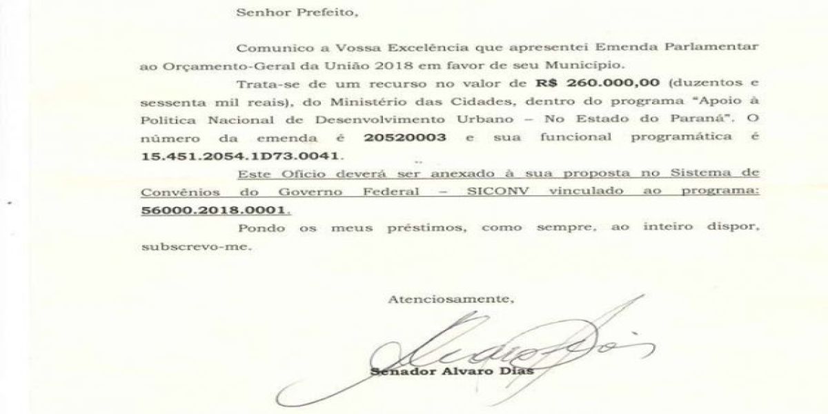 O Senador Álvaro Dias comunicou oficialmente a Prefeitura Municipal de Corbélia a destinação de verba de R$ 260 mil.