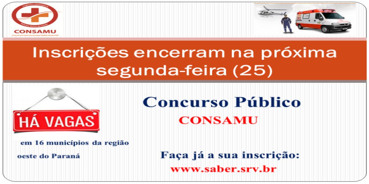 As inscrições para o Concurso Público do CONSAMU (Consórcio Intermunicipal SAMU Oeste) encerram na próxima segunda-feira (25).