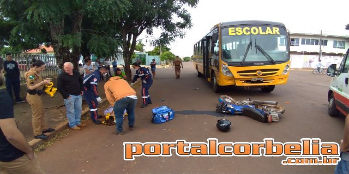 Uma colisão envolvendo uma moto e um ônibus escolar foi registrado na rua Violeta no cruzamento com a rua Jasmin no centro de Corbélia no início desta tarde por volta das 12h00.
