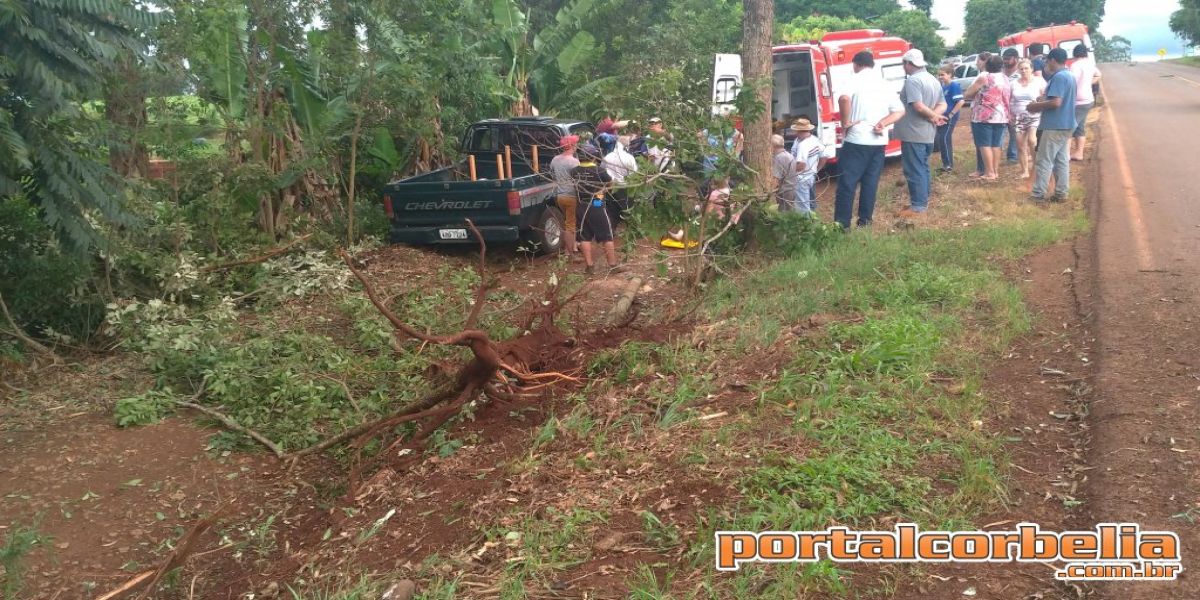Um veiculo D20 colidiu contra uma árvore que com a força do impacto foi arrancada, no km3,5 da PR574 após o condutor perder o controle ao desviar de uma moto.