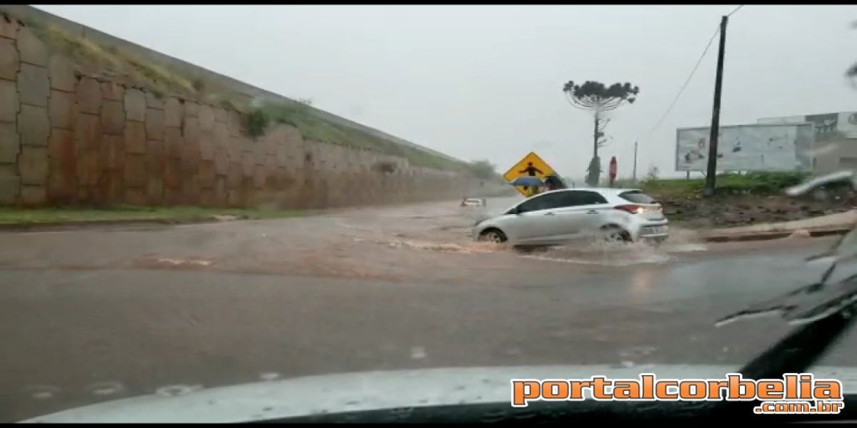 No acesso secundário à cidade de Corbélia a tubulação não deu conta e a marginal ficou inundada. Um veículo que passava no momento da chuva ficou ilhado no local.