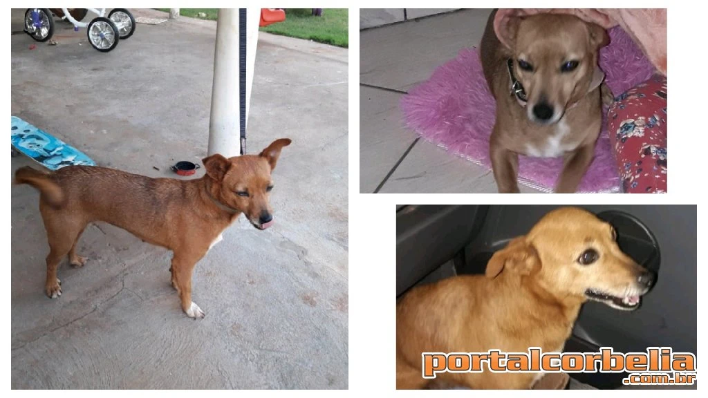 A cachorra conhecida como Xereta desapareceu na rua Violeta nas proximidades do Colégio Amancio Moro. Ela estava com uma coleira azul de nylon.