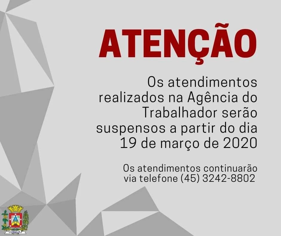 A partir do dia 19 de março de 2020, os atendimentos ao público na Agência do Trabalhador serão suspensos decorrente a pandemia do coronavírus – COVID-19. Os atendimentos serão feitos somente por meio de ligações telefônicas no número (45) 3242-8802.