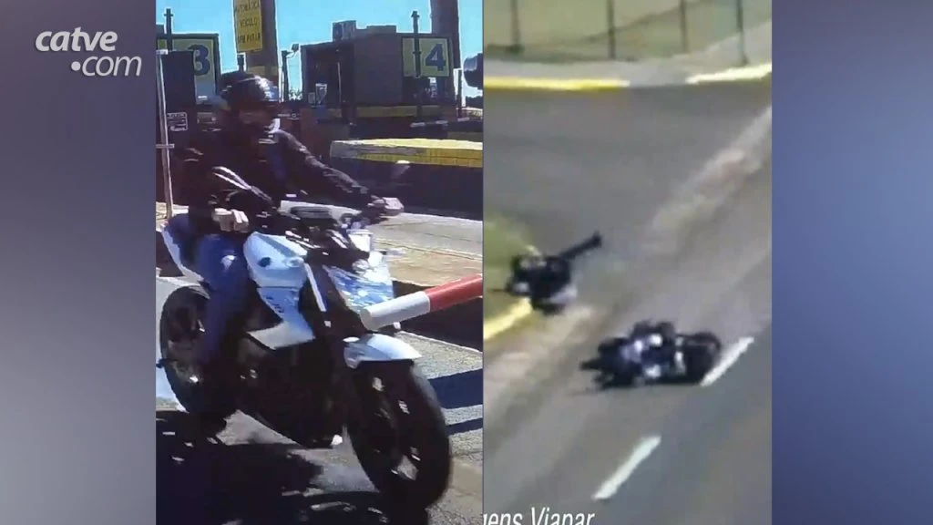 Imagens mostram o momento que ele fura pedágio da BR 369 em Corbélia e sofre a queda