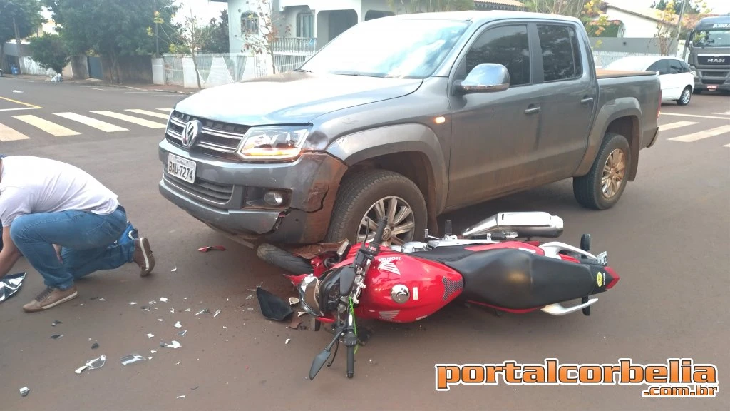 Uma colisão envolvendo uma Amarok e uma moto cb300 foi registrada no final da tarde desta terça feira no cruzamento das ruas Primavera e Rosa no centro de Corbélia.