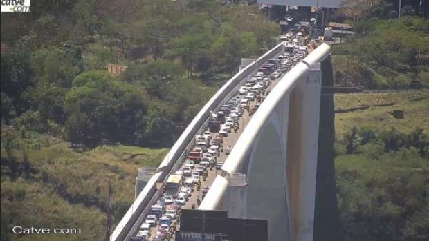 Milhares de carros, motocicletas e caminhões dividem as três pistas dos mais de 550 metros de extensão.
