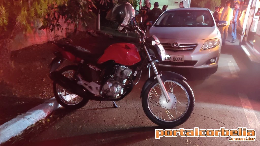 Uma colisão envolvendo um Corolla e uma motocicleta foi registrado no início da noite desta quinta feira por volta das 19h20 na Avenida Paraná na esquina com a Minas Gerais em Corbélia.