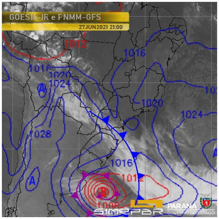 A Defesa Civil de Corbélia informou nesta segunda-feira (28/06), que segundo o Simepar o avanço da frente fria pelo Paraná ainda mantém o tempo muito instável em vários setores. Chove em praticamente todas as regiões, mas com intensidade fraca/moderada. Destaque para o ingresso de ar frio no Sul do Brasil.