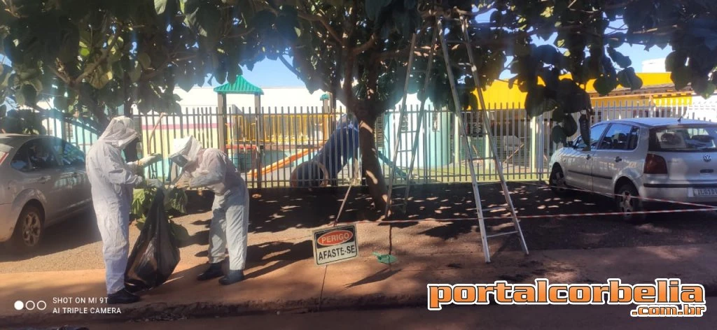 Uma equipe da Defesa Civil de Corbélia foi acionada no início da tarde desta terça feira por volta das 13h30 no Cmei Iracema Zanato onde segundo informações um enxame de abelhas havia se instalado em frente ao local causando risco a todos que circulavam pelo local, principalmente as crianças que chegavam ao Cmei.