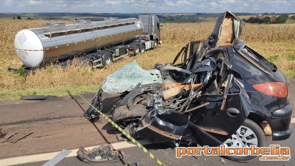 Um veículo Peugeot ficou totalmente destruído em uma colisão frontal contra uma carreta no início da tarde deste domingo no KM509 da BR369 entre as cidades de Corbélia e Cascavel. Com a força do impacto o condutor do veículo identificado como Eduardo Cleiton Batista de 41 anos teve morte instantânea, ele era morador da cidade de Cascavel.