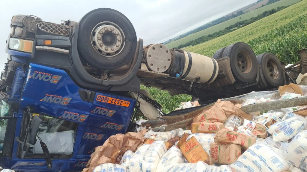 Uma carreta carregada com Açúcar tombou na manhã desta terça-feira pro volta das 09h30 na BR369 no KM487 nas proximidades do distrito de Nossa Senhora da Penha em Corbélia. Após o acidente o veículo parou as margens da pista.