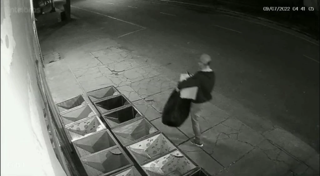 Nas imagens é possível ver a movimentação de um homem próximo à loja e posteriormente o mesmo saindo com sacolas que possivelmente sejam os produtos roubados.