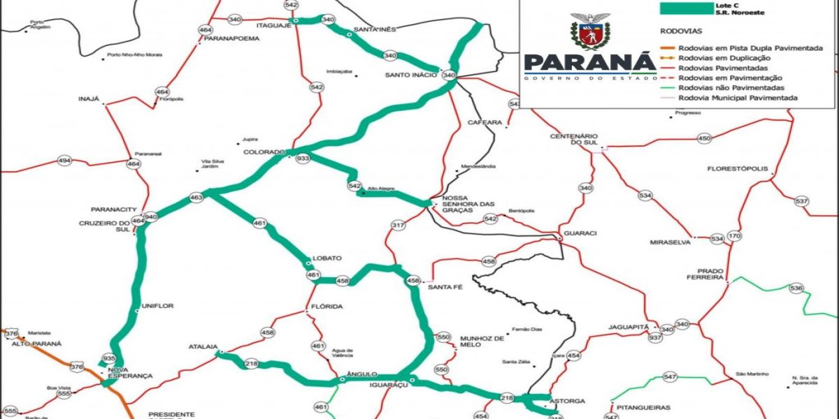 O Departamento de Estradas de Rodagem (DER-PR) publicou no Diário Oficial e no Portal Compras Paraná o resultado da classificação final da licitação para obras em 238,25 quilômetros de rodovias estaduais da região Noroeste, entre Maringá e a divisa com São Paulo. A obra vai beneficiar mais de 168 mil habitantes da região, com impacto direto em 17 municípios: Ângulo, Astorga, Atalaia, Colorado, Cruzeiro do Sul, Iguaraçu, Itaguajé, Lobato, Mandaguaçu, Munhoz de Mello, Nossa Senhora das Graças, Nova Esperança, Paranacity, Santa Fé, Santa Inês, Santo Inácio e Uniflor.