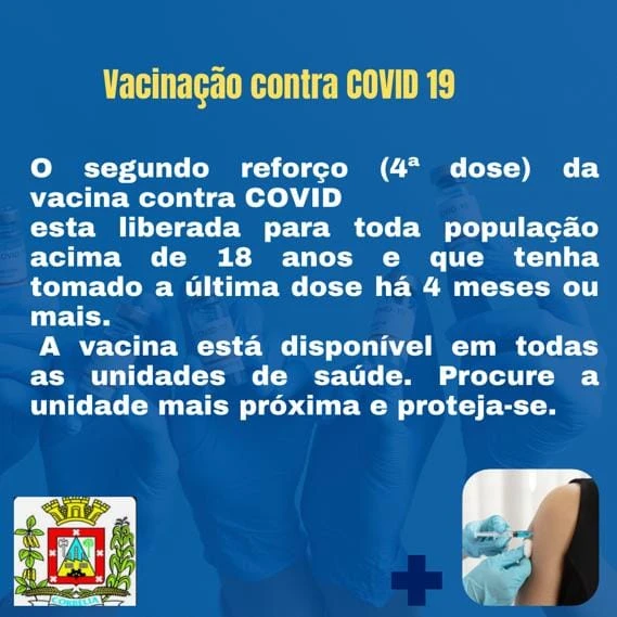 O segundo reforço (4ª dose) da vacina contra a Covid está liberado para toda população acima de 18 anos e que tenha tomado a última dose há 4 meses ou mais.