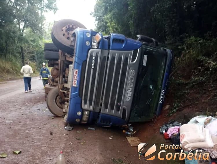Um caminhão Scania tombou no início desta manhã por volta das 07h40 no KM22 da PR-574 no trecho entre a cidade de Cafelandia e o Distrito de Nossa Senhora da Penha em Corbélia.