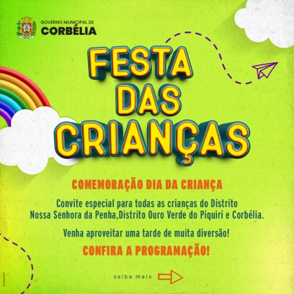 A "Festa das Crianças" é uma celebração exclusiva para as crianças de Corbélia. A Prefeitura convida todas as famílias a trazerem seus filhos para participar deste evento que foi pensado especialmente para proporcionar alegria, diversão e momentos especiais para os pequenos.