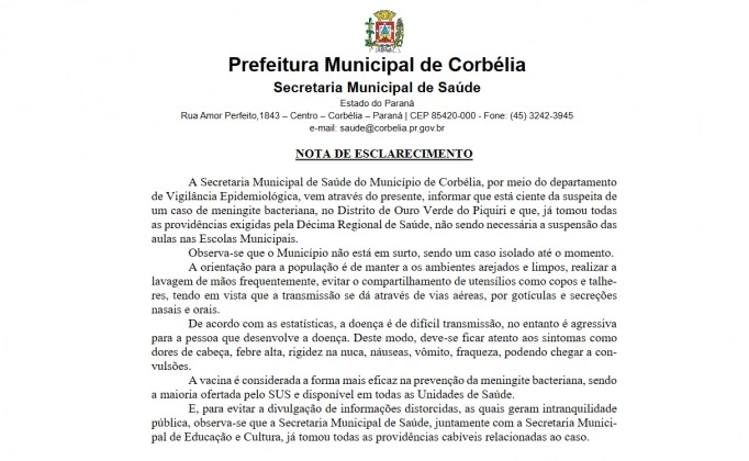 A Secretaria Municipal de Saúde do Município de Corbélia, por meio do departamento de Vigilância Epidemiológica, vem através do presente, informar que está ciente da suspeita de um caso de meningite bacteriana, no Distrito de Ouro Verde do Piquiri e que, já tomou todas as providências exigidas pela Décima Regional de Saúde, não sendo necessária a suspensão das aulas nas Escolas Municipais.
