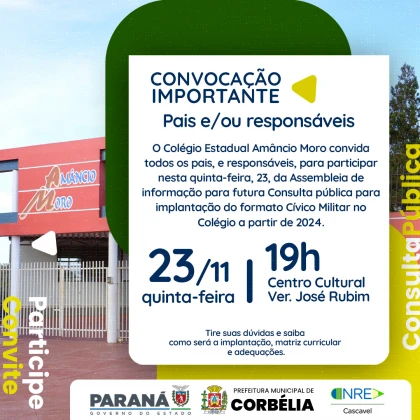 As equipes do Núcleo Regional de Educação, do Colégio Estadual Amâncio Moro, e direção da instituição convocam todos os pais, responsáveis e membros da comunidade escolar para uma Assembleia de Informação marcada para a esta quinta-feira, 23 de novembro, às 19h no Centro Cultural Ver. José Rubim. O encontro tem como objetivo discutir a possível implantação do formato Cívico Militar a partir do ano de 2024.