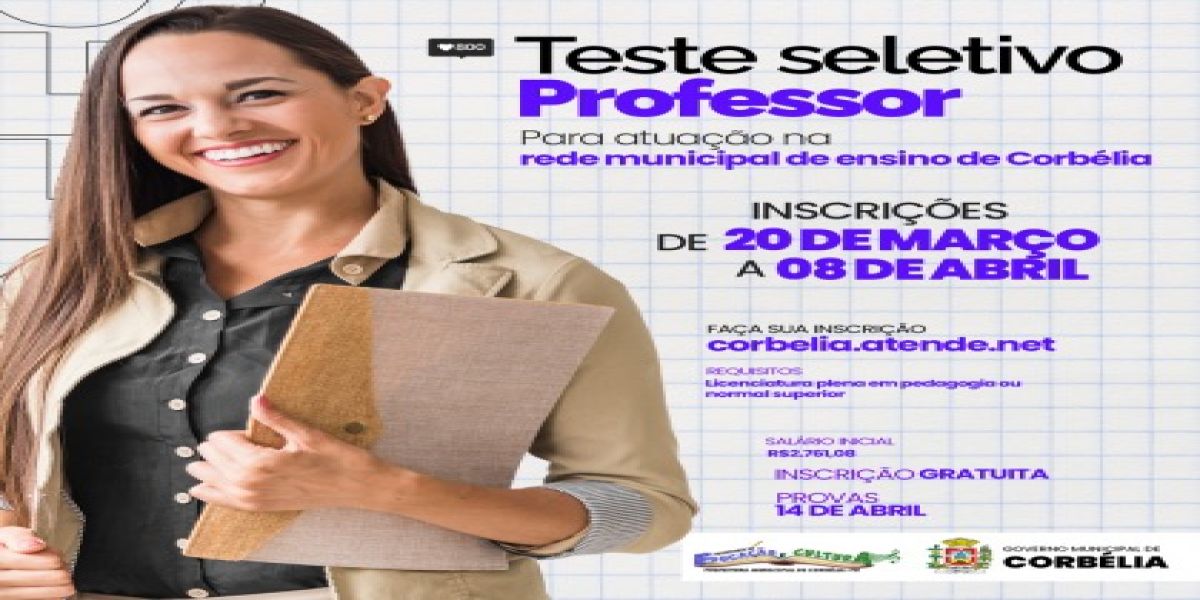Encerram nesta segunda-feira, 08, as inscrições para o Teste Seletivo de Professores para atuação da rede municipal de ensino de Corbélia. As vagas são temporárias e provisórias, e irão atender à demanda emergencial do município. Segundo o edital são 12 vagas abertas no total.