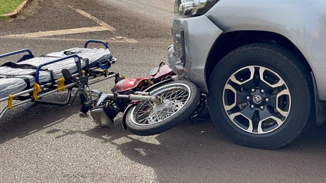 Moto fica sob caminhonete após colisão no trevo da BR-369 e deixa dois feridos em Corbélia