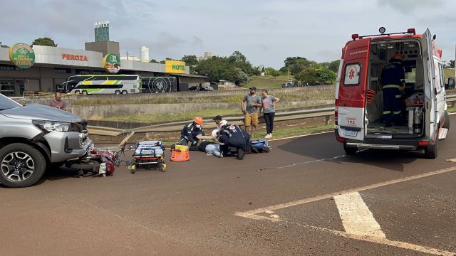 Casal em moto é atingido por caminhonete no trevo da BR-369 com a PR-573; Samu atende vítimas e Defesa Civil sinaliza o local.