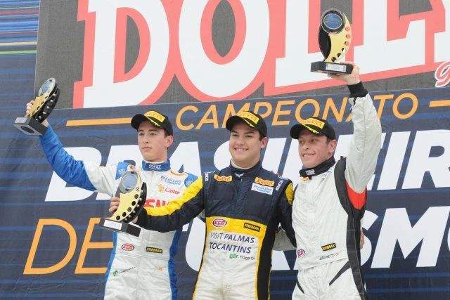 Cascavel (PR) - Felipe Fraga fez a festa na manhã deste domingo no Autódromo de Cascavel. O piloto de 17 anos venceu pela segunda vez, levou mais um Troféu Dolly, na temporada e abriu oito pontos na liderança. Ele só não conquistou vantagem maior por Gabriel Casagrande ter ficado novamente em segundo lugar, com João Pretto em terceiro e Pedro Boesel em quarto. Boesel cruzou a linha de chegada com o carro batido, pois a prova terminou com o Safety Car na pista.
