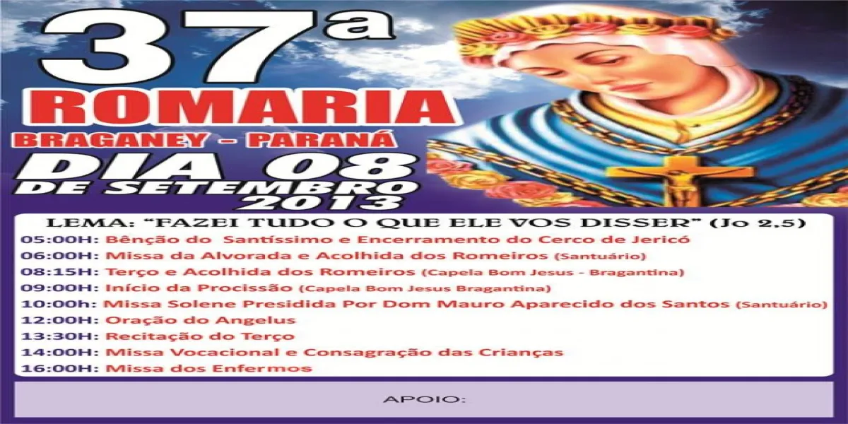Caravanas de municípios do Oeste, de outras regiões do Paraná e até de outros estados são aguardadas para a 37ª edição da Romaria ao Santuário de Nossa Senhora da Salette, em Braganey. O evento está agendado para 8 de setembro e espera reunir mais de dez mil pessoas. “Há muitos devotos de Nossa Senhora da Salette que participam para fazer pedidos e para agradecer. E anualmente o evento se torna ainda mais importante”, segundo Ana Maria Benedito, que atua na secretaria da paróquia.