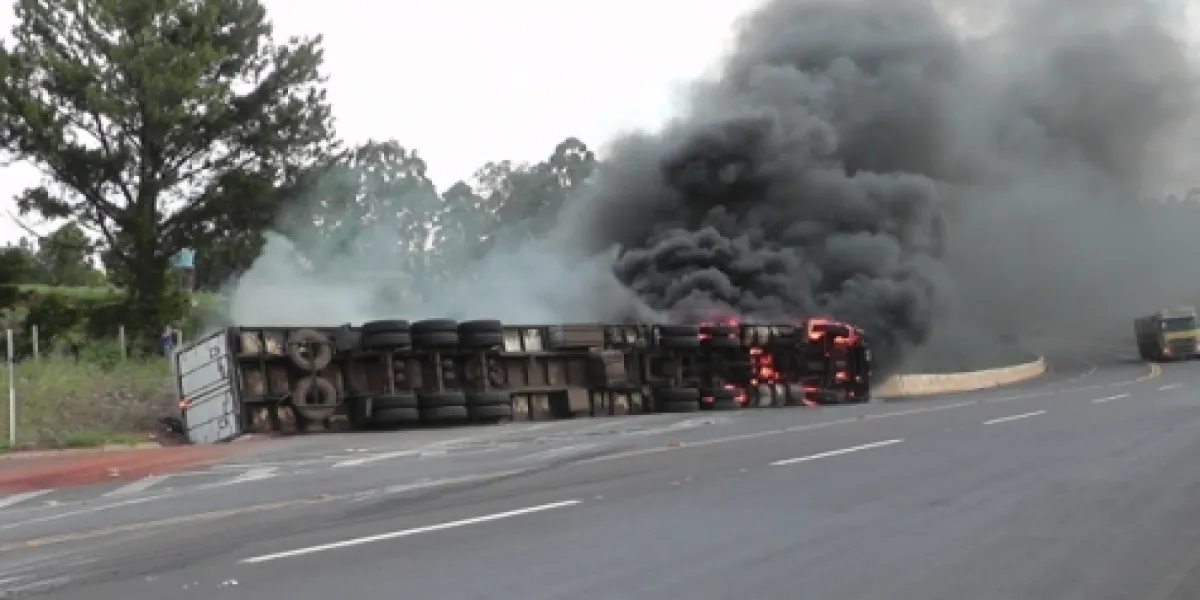 Um grave acidente foi registrado no Contorno Oeste em Cascavel na tarde deste domingo (1º). Um caminhão frigorífico de Toledo tombou ao acessar a BR-163 e logo depois pegou fogo.