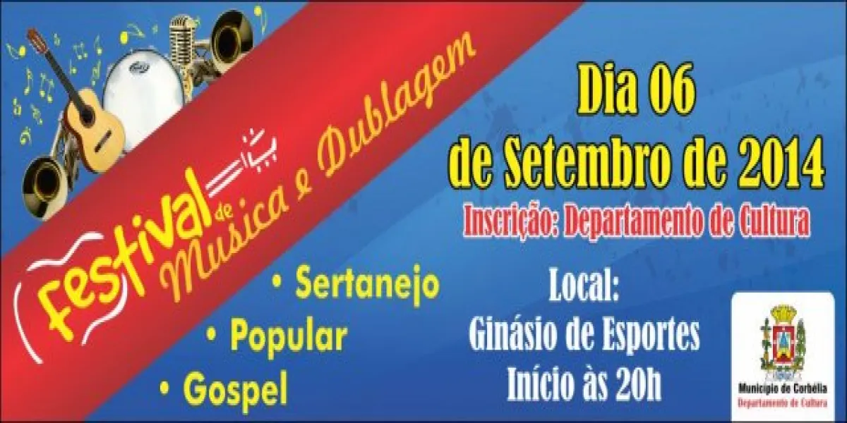 O Município de Corbélia vai realizar no próximo sábado (06), a primeira edilção do Festival Municipal de Musica. Será no ginásio de esportes com início marcado para as 21 horas. As inscrições serão realizadas até quarta-feira (03) no Departamento de Cultura que funciona junto ao Museu, em um prédio em frente à prefeitura. Serão julgadas apresentações no estilo sertanejo, popular, e gospel. O Festival abre as portas artísticas uma vez que o primeiro e segundo colocados em cada categoria participarão da etapa regional do Fermop, no dia 12 de setembro, em Cascavel.