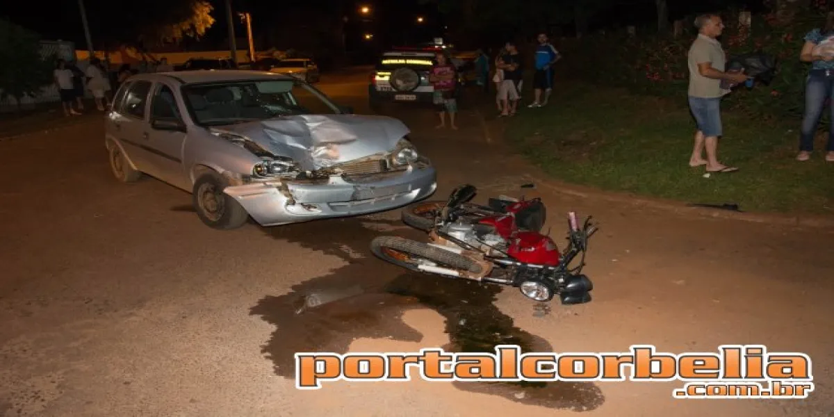 Um veículo Corsa e uma motocicleta colidiram frontalmente hoje (12) por volta das 20h40
