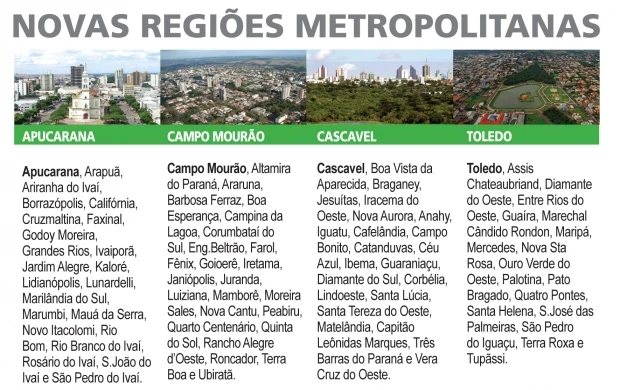 Agora, são oito as regiões metropolitanas no Estado. As quatro novas se juntam às de Curitiba, Umuarama, Londrina e Maringá.