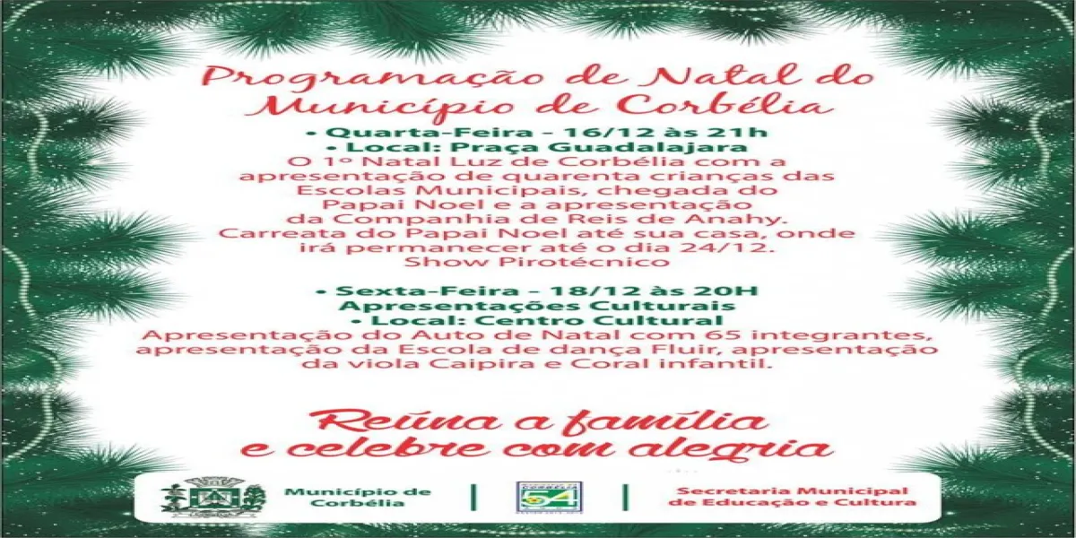 Na sexta-feira dia 18 no Centro Cultural será realizada apresentação do Auto de Natal com 65 integrantes, apresentação da Escula de Dança Fluir, apresentação da Viola Caipira e Coral Infantil.