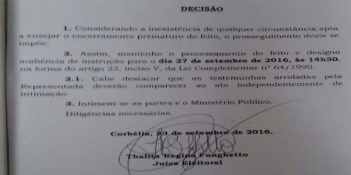 Além dos candidatos, a Secretária de Saúde Lurdes Staffen também entra como ré, porque se houve a filmagem entende-se que houve autorização. A Juíza Eleitoral Thalita Regina Funghetto acatou a denúncia e deu andamento no processo conforme anexo, com audiência já determinada.
