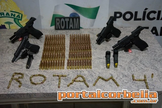 Uma equipe da Rotam de Corbélia realizou uma abordagem de rotina por volta das 22h40 desta terça-feira (11) a um ônibus que fazia a linha Foz do Iguaçu/São Paulo e durante buscas localizaram 4 armas, sendo elas 2 pistolas calibre 9mm (restrito), 1 pistola .40 (calibre restrito) e 1 pistola calibre 380, e ainda 600 munições de diversos calibres em uma mochila de um passageiro.