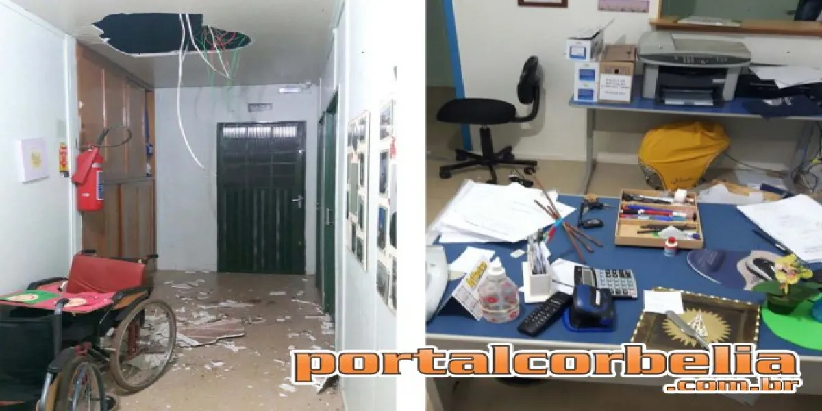No interior do estabelecimento estava tudo revirado, gavetas abertas, e teto de gesso quebrado.