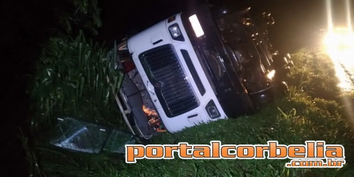 O veículo estava carregado com soja e possivelmente será retirado apenas pela manhã, pois a carga terá que ser removida e a pista precisará ser bloqueada para facilitar a remocao.