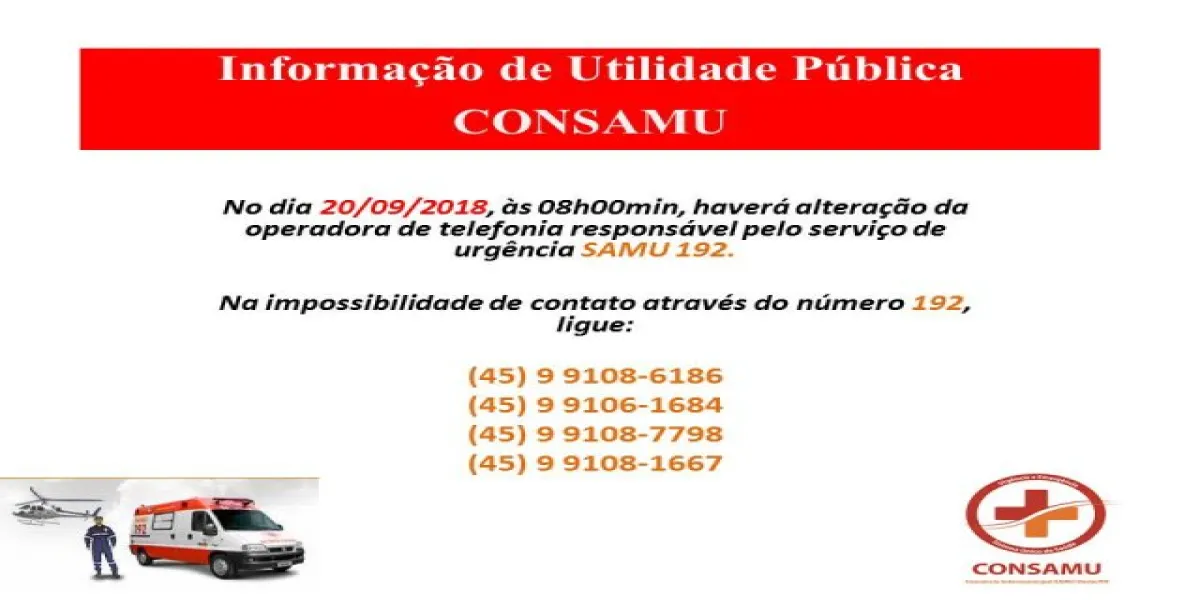 O CONSAMU informa que haverá alteração na operadora de telefonia responsável pelo serviço de urgência 192 no dia 20/09 e que poderão ocorrer dificuldades no acionamento da Central de Regulação.