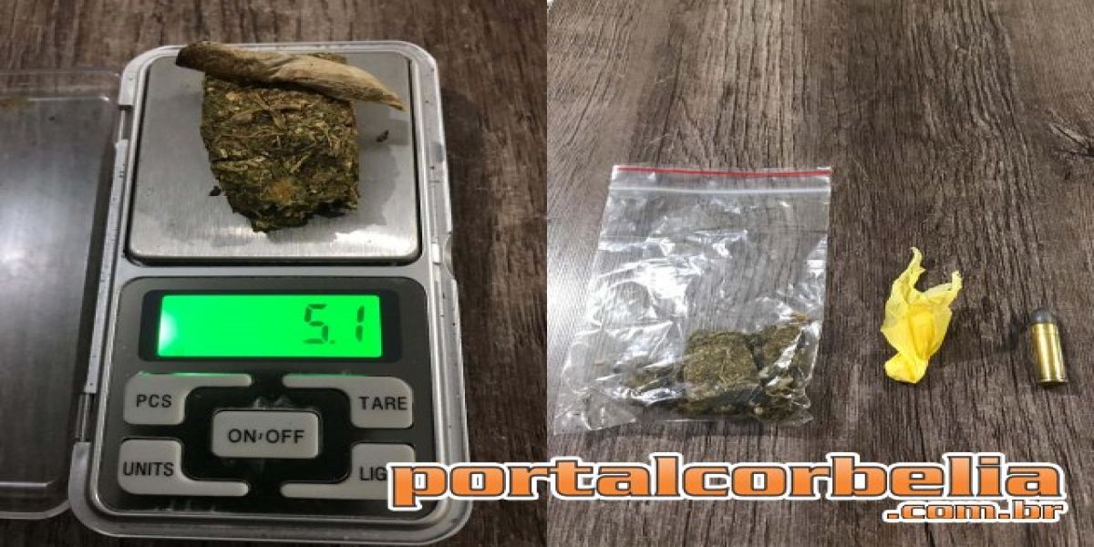 Durante abordagem de rotina nessa madrugada realizada pela equipe ROTAM, homem de 36 anos preso com uma porção de maconha em seu veículo, posteriormente durante buscas em sua residência foi localizado uma porção de cocaína e uma munição calibre 38.