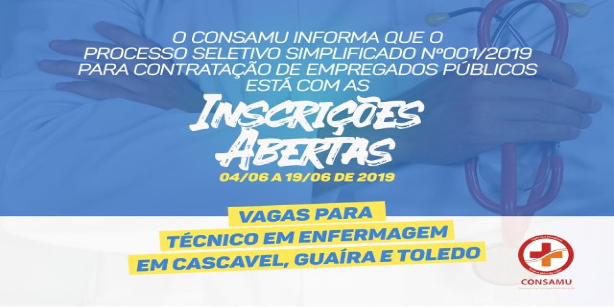 As inscrições para o Processo Seletivo Simplificado do Consórcio Intermunicipal SAMU Oeste – CONSAMU poderão ser realizadas até o dia 19/06/2019, das 8h30 às 11h30 e das 14h às 17h (horário de Brasília), de segunda a sexta-feira (exceto feriados), na sede do CONSAMU (Setor de Recursos Humanos), localizada na Rua Uruguai, nº 283, bairro Alto Alegre, em Cascavel/PR ou, ainda, via SEDEX.