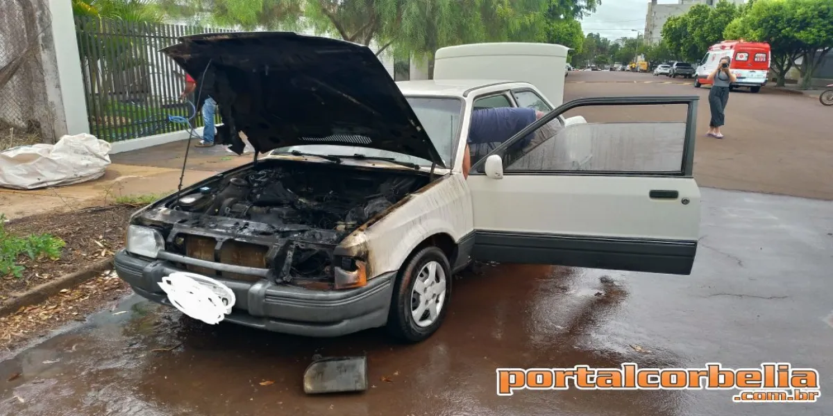 Um veículo Verona ficou destruído nesta manhã na rua Ipê Amarelo após um incêndio possivelmente causado na parte elétrica.