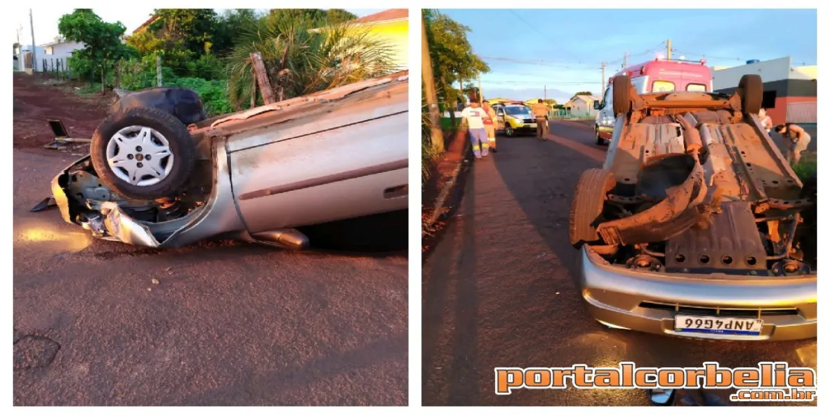 Um veículo Classic capotou no início da manhã deste sábado por volta das 05h30 na rua Tiradentes na esquina com a rua Getúlio Vargas no bairro Jardim Vera Lúcia em Corbélia.