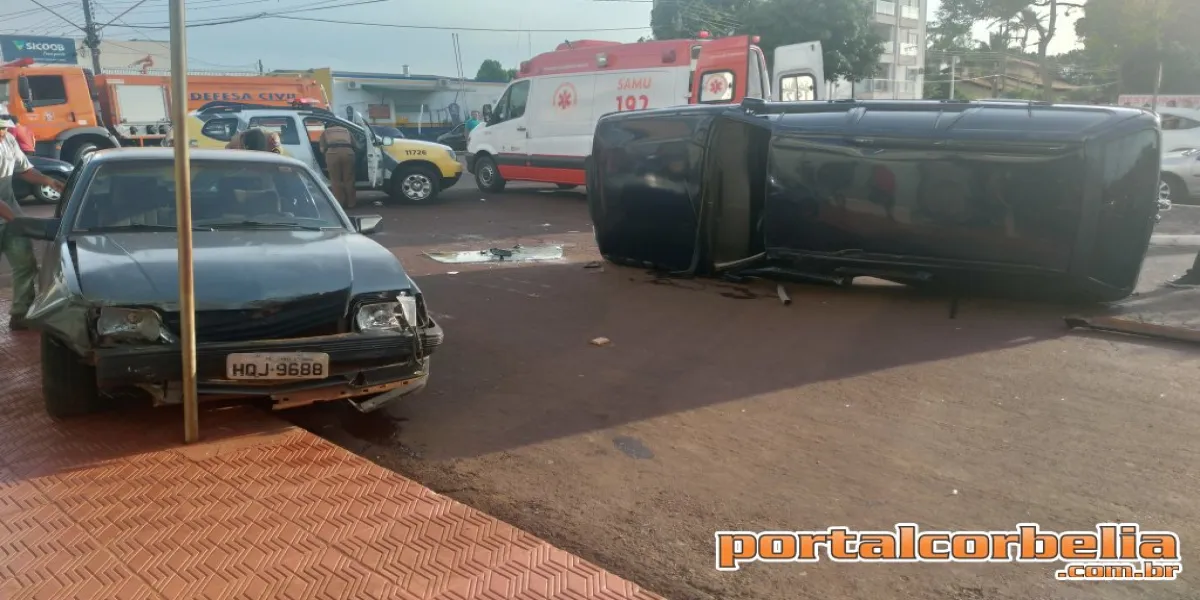 Uma colisão seguida de capotamento envolvendo dois veículos, um Santana Quantum e um Monza, foi registrada no final da tarde desta terça feira por volta das 17h50 na avenida Santa Catarina na esquina com a rua Rosa em Corbélia.