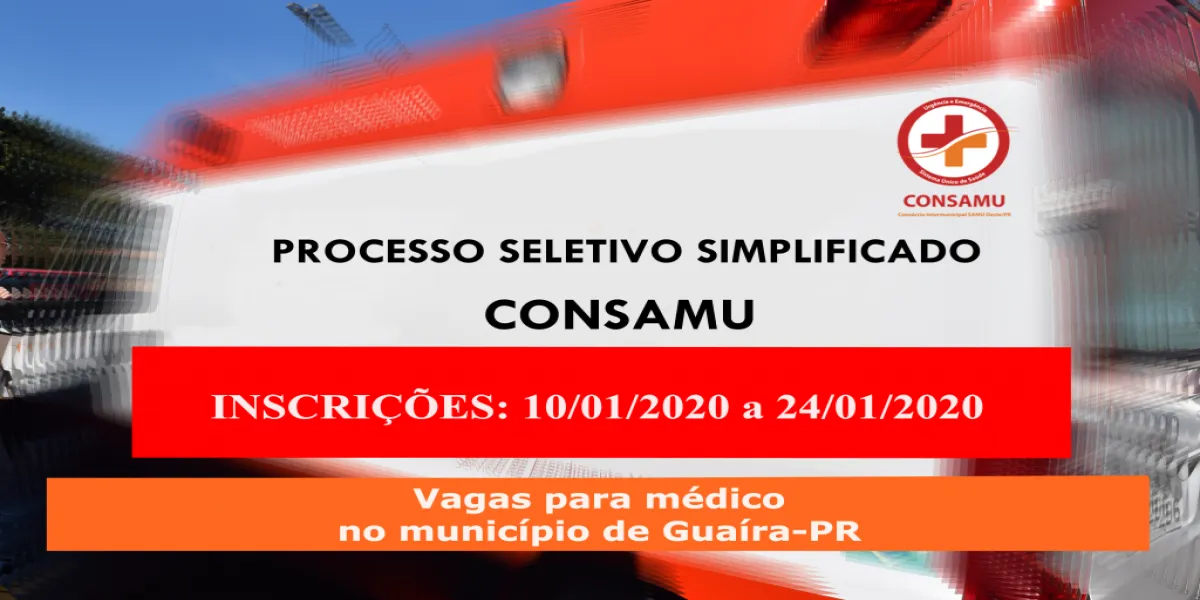 As inscrições para o Processo Seletivo Simplificado (PSS) do CONSAMU (Consórcio Intermunicipal Samu Oeste) encerram nesta sexta-feira (24).