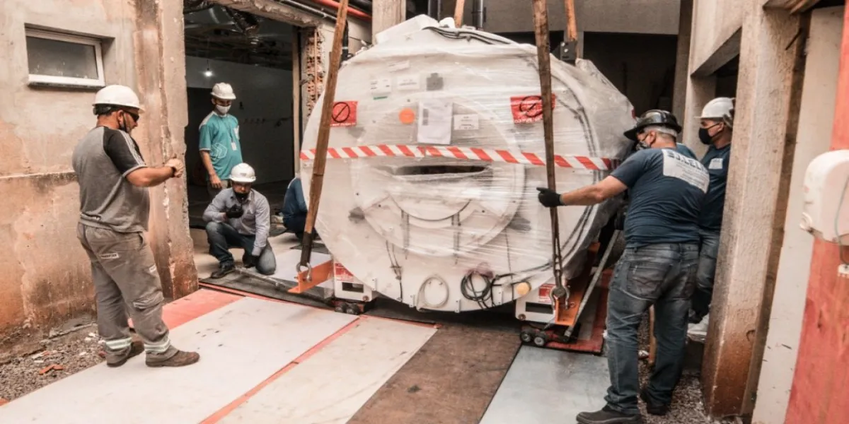A última etapa da instalação da ressonância magnética do Hospital Universitário do Oeste do Paraná (Huop) demandou horas e até mesmo um guindaste telescópico para levantar o equipamento, que pesa 6 toneladas, até a sala onde será concluída a estrutura. Em 30 anos, esta é a primeira vez que uma operação tão grande é realizada no hospital, tendo o protocolo planejado e executado sem nenhuma intercorrência, durante este sábado (08).