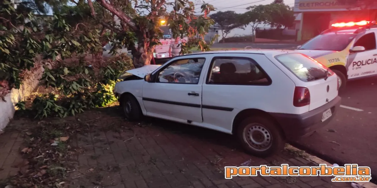 Um veículo gol colidiu contra uma árvore após perder o controle e invadir a pista contrária na Avenida Santa Catarina em Corbélia.